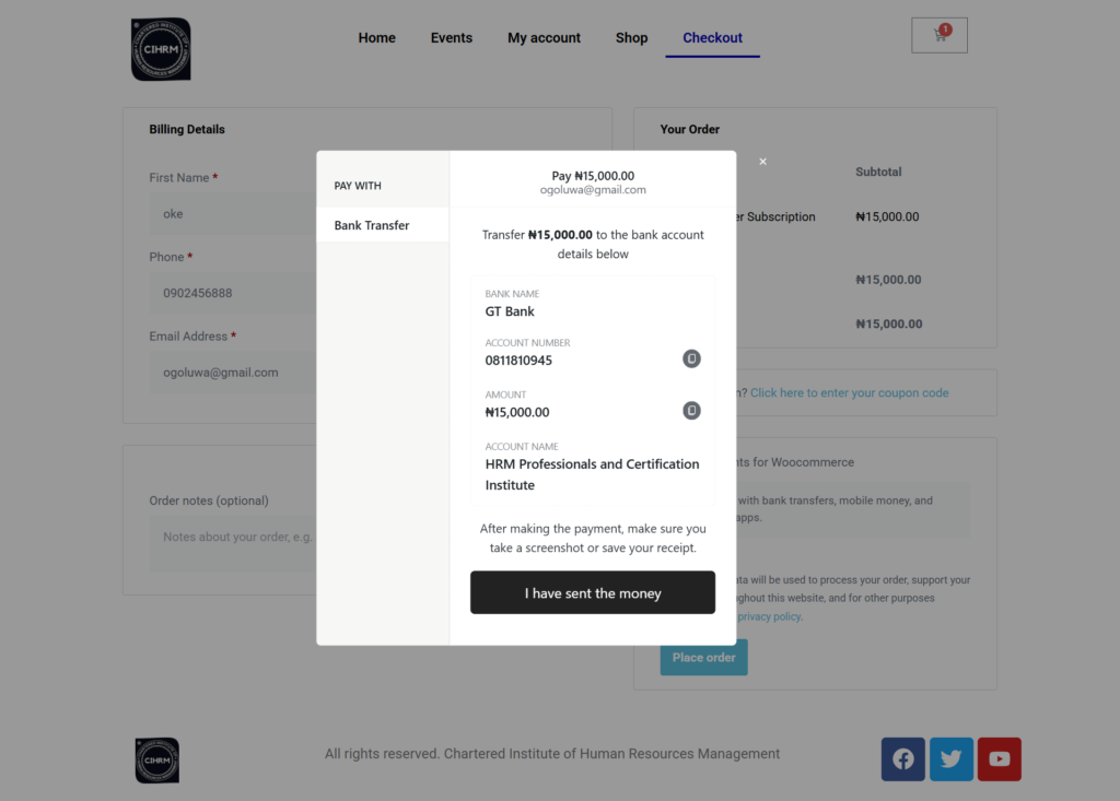You will see a pop up to complete your payment. If you have already made a payment it is fine, all you need to do is click on “I have sent the money” upload your payment receipt and submit.